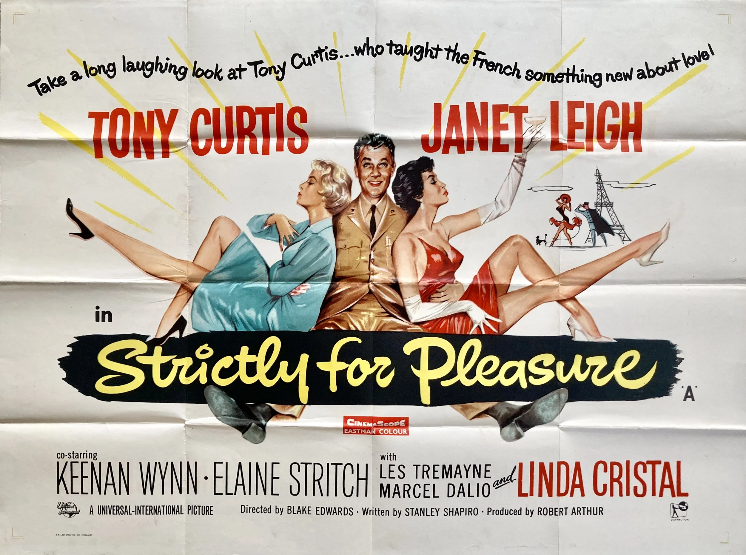 Fun and frivolous fifties artwork for this 1958 original quad poster for Strictly for Pleasure starring Tony Curtis, Janet Leigh and Linda Cristal, directed by Blake Edwards